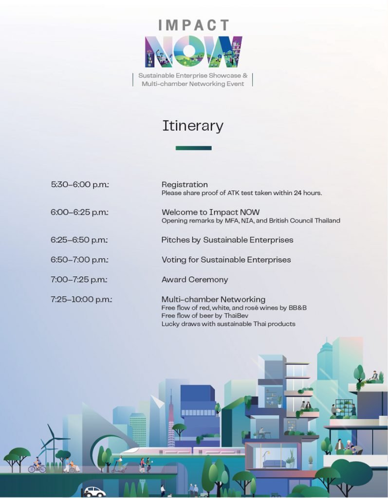 Impact NOW serves to build capacity for Thailand-based sustainable enterprises to communicate their impacts internationally and provide opportunities to build partnerships for the UN Sustainable Development Goals. Hence, this is an exceptional opportunity for the foreign business community to lend their voice to the social entrepreneurship ecosystem in Thailand. More notably, you also receive a chance to hear pitches by featured sustainable enterprises in Thailand and vote for one outstanding enterprise to be recognised with the Impact NOW “Best in Show” Award 2022.