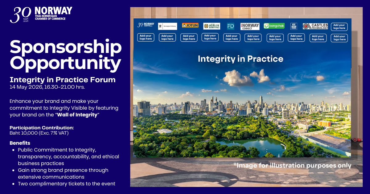 Register HereThe Thai-Norwegian Chamber of Commerce (TNCC), in collaboration with the Royal Norwegian Embassy in Bangkok is hosting an exceptional event, Integrity in Practice Forum – Shaping the Future through Responsible Governance. This event aims to strengthen business opportunities while promoting sustainable and responsible practices.