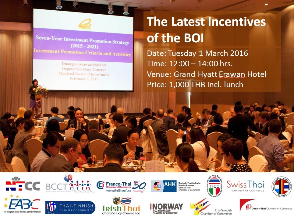 TNCC members are invited to attend the joint chambers’ luncheon. Khun Duangjai Asawachintachit, Deputy Secretary General of Thailand Board of Investment, will give you the update of BOI’s latest incentives.
